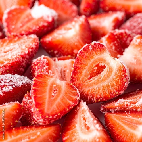 Frozen strawberry halves arranged in pattern on white background, close-up