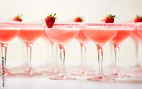 Frozen strawberry margarita cocktails on white background. Front view. Classic drink menu concept.