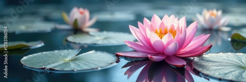 Frozen water lilies with delicate dahlia stems, frozen flowers, ice