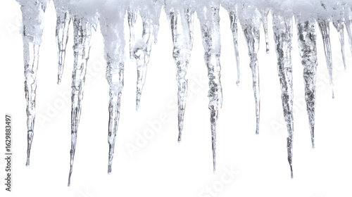 Frozen white hanging icicles, sharp and glossy, isolated on white
