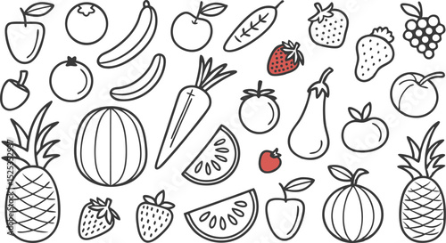 Fruit berry vegetable food line icon vector set. minimalist vector illustration featuring a large collection of outlined fruits and vegetables.