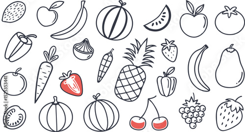 Fruit berry vegetable food line icon vector set. minimalist vector illustration featuring a large collection of outlined fruits and vegetables.