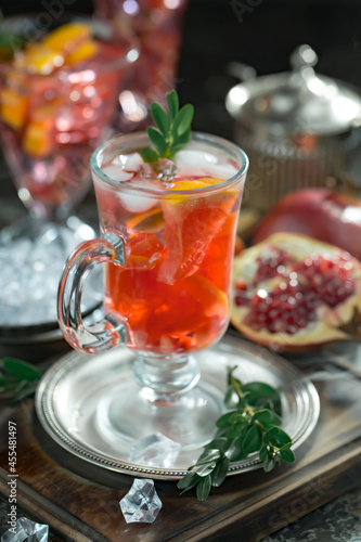 Fruit cocktail, in a glass with natural healthy fruits on a table with kitchen accessories.