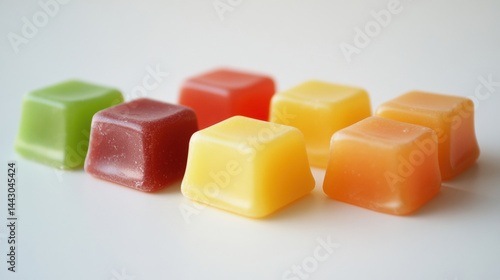 Fruit gums . Delightful assortment of colorful fruit jellies arranged on a white background.