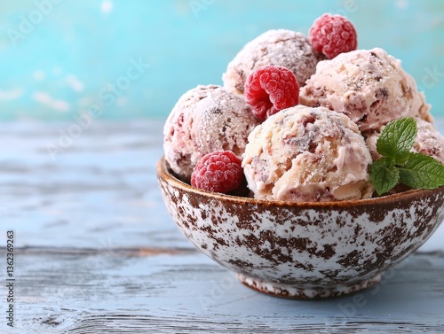 Fruit infused berry ice cream served in a rustic wooden bowl on a stone surface with creamy texture and natural light bringing out the colorful frozen dessert palette