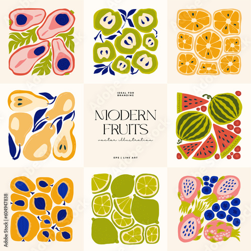 Fruits abstract elements. Food and healsy composition. Modern trendy Matisse minimal style. Fruits poster, invite. Vector arrangements for greeting card or invitation design