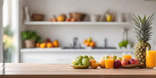 fruits and juice on wooden tabletop counter. in front of bright out of focus kitchen. copy space.