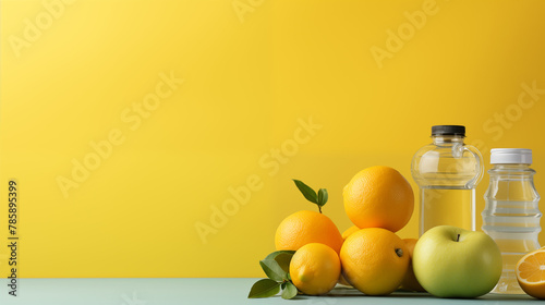 fruits and water bottles on a yellow background