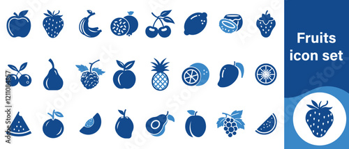 Fruits icon set, fruit, illustration, health, set, background, pumpkin, pineapple, tropical, orange, food, juice, strawberry, exotic, lemon, icon, cauliflower, coconut and more.