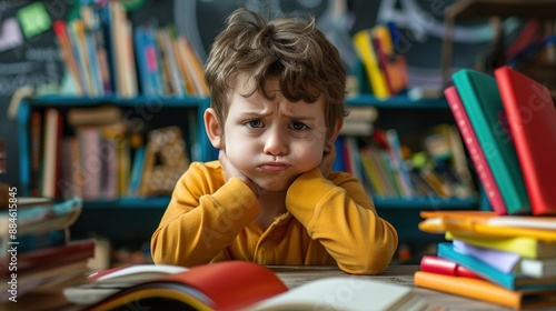 Frustrated Child Doing Homework Surrounded by Colorful Books