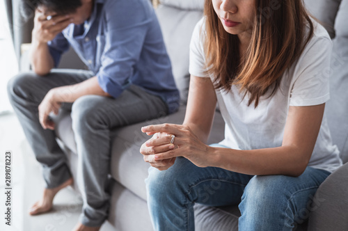 Frustrated sad wife taking off the wedding ring, Young couple breaking up divorce concept
