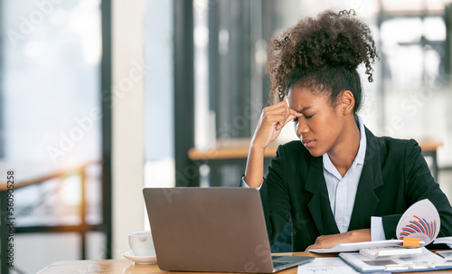 Frustrated young african american woman keeping eyes closed and massaging nose after working at laptop for long time in office