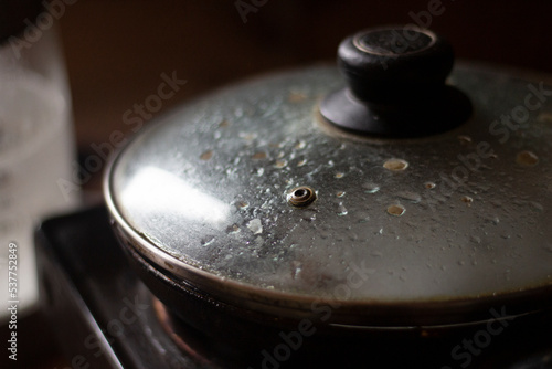 Frying pan in kitchen. Lid on frying pan. Cooking.