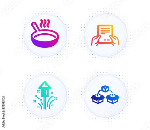 Frying pan, Receive file and Fireworks icons simple set. Button with halftone dots. Parcel shipping sign. Cooking utensil, Hold document, Christmas pyrotechnic. Send box. Business set. Vector