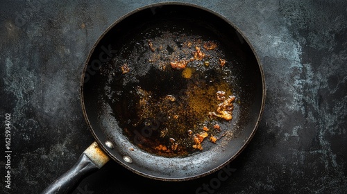 Frying pan with crusted-on food remains and oily patches, showcasing the aftermath of frying meat or vegetables