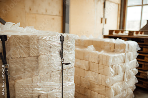 fuel briquettes on the conveyor. plant for the production of pressed environmentally friendly fuel from wood waste