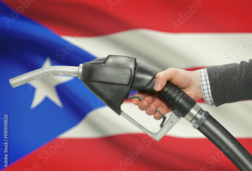 Fuel pump nozzle in hand with national flag on background - Puerto Rico