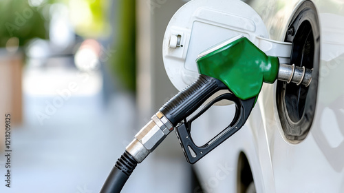Fuel pump nozzle inserted into car gas tank, ready for refueling