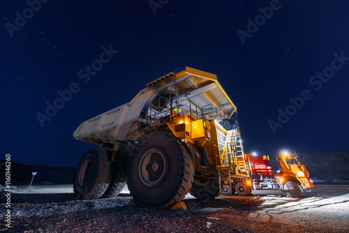 Fuel tanker car refueling large quarry dump truck in mining quarry, night work