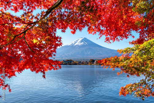 Fuji Mountain in Autumn Red Maple Leaves Frame at Kawaguchiko Lake, Japan