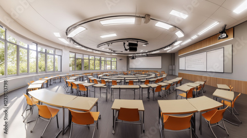 full 360 degree panorama environment map of empty abstract white classroom with chairs and tables 3d render illustration hdri hdri vr style