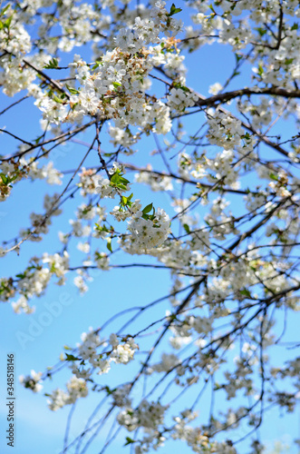Full bloom Cherry, Spring Flower, white Cherry Flower. The branches of a blossoming tree. Blurring background.