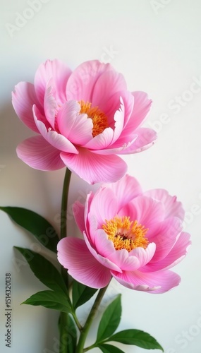 Full bloom pink peonies, pristine white backdrop, vibrant, background, fresh