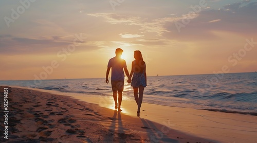 Full body back view young lovely couple two friends family man woman in casual clothes hold hands walking stroll together at sunrise over sea beach ocean outdoor exotic seaside in summ : Generative AI
