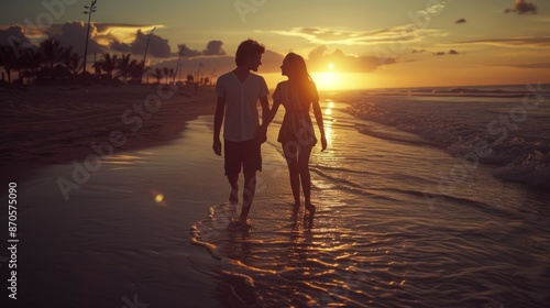 Full body back view young lovely couple two friends family man woman in casual clothes hold hands walking stroll together at sunrise over sea beach ocean outdoor exotic seaside in summer day evening