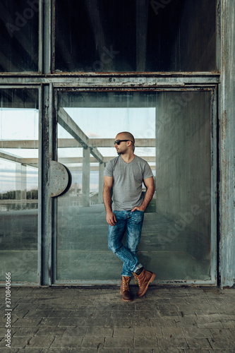 Full body confident young male in trendy outfit and sunglasses looking away while standing against glass wall of aged building