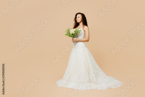 Full body happy smiling happy beautiful young woman bride wears wedding dress posing hold flowers isolated on plain pastel light beige background studio portrait. Ceremony celebration party concept.