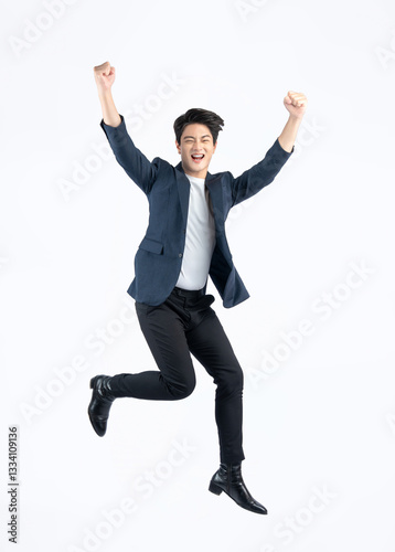 Full body image of a young Asian business man posing on a white background