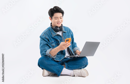 Full body image of Asian guy using laptop and phone and headphone on white background