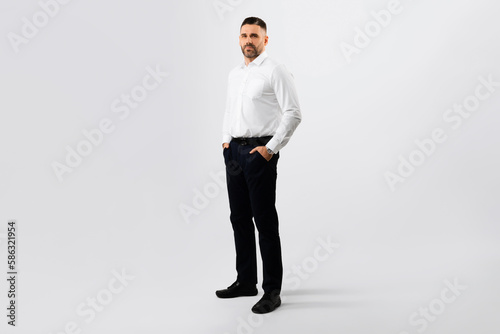 Full body length shot of middle aged male entrepreneur holding hands in pockets, posing over light grey background