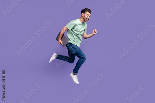 Full body photo of attractive young guy run fast hold netbook hurry meeting wear trendy gray outfit isolated on violet color background