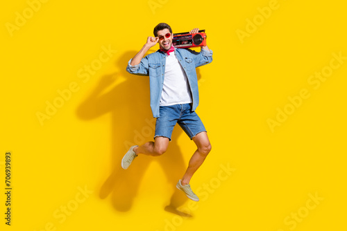 Full body photo of cheerful man dressed denim shirt flying touch glasses hold boombox at summer event isolated on yellow color background