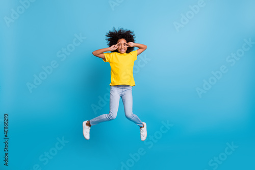Full body photo of dark skin brunette small girl make v-signs jump wear yellow t-shirt jeans isolated on blue color background