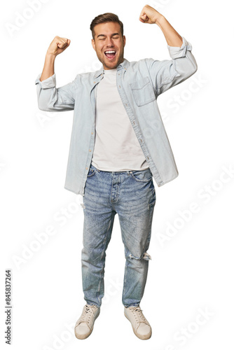 Full body portrait of a man in studio raising fist after a victory, winner concept.