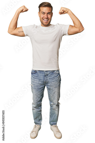 Full body portrait of a man in studio showing strength gesture with arms, symbol of feminine power