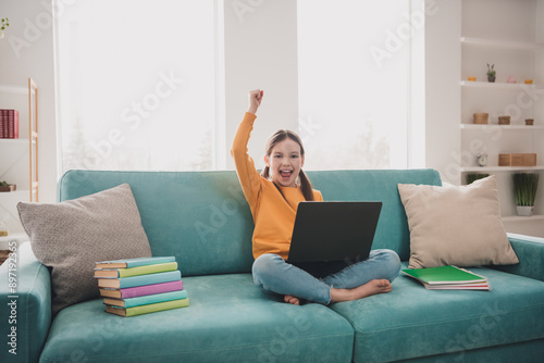 Full body portrait of cute schoolchild sitting couch laptop raise fists study learn flat indoors