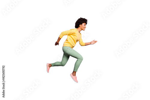 Full body profile side photo of positive brunette curly hair dark skin girl hear news fall spring discounts jump run wear yellow pullover green pants trousers isolated violet purple color background