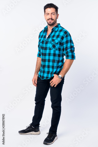 Full body shot of young handsome bearded hipster man