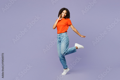 Full body side view little kid teen girl of African American ethnicity she wears orange t-shirt put hand on face raise up leg isolated on plain pastel purple background. Childhood lifestyle concept.