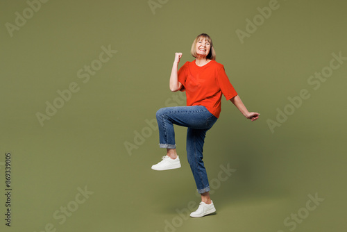 Full body side view smiling happy elderly blonde woman 50s years old wear orange t-shirt casual clothes do winner gesture isolated on plain pastel green background studio portrait. Lifestyle concept.