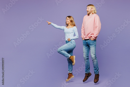 Full body side view young fun shocked couple two friends family man woman wearing pink blue casual clothes together point index finger aside on area mock up isolated on pastel plain purple background.