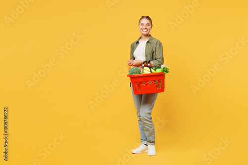 Full body side view young woman wear casual clothes hold bag basket for takeaway mock up with food products look camera isolated on plain yellow background. Delivery service from shop or restaurant.