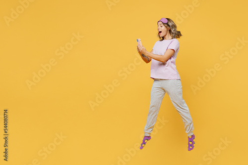 Full body side view young woman wears purple pyjamas jam sleep eye mask rest relax at home jump high hold use mobile cell phone isolated on plain yellow background studio portrait. Night nap concept.