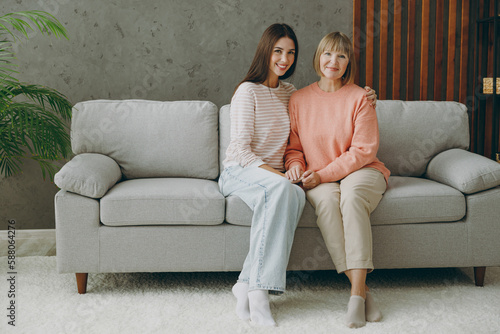 Full body two adult women mature mom young kid wear casual clothes look camera hold hands hug sit on gray sofa couch stay at home flat rest relax spend free spare time in living room. Family concept.