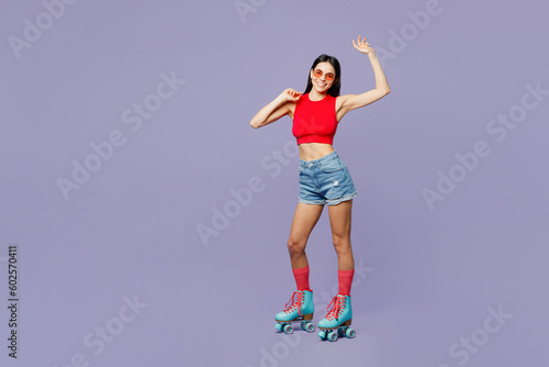 Full body young fun latin woman wears red casual clothes rollers sunglasses rollerblading stand akimbo look camera isolated on plain pastel purple background. Summer sport lifestyle leisure concept.