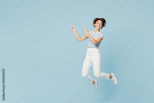Full body young fun woman wears striped t-shirt casual clothes jump high point index finger aside on area mockup isolated on plain pastel light blue cyan background studio portrait. Lifestyle concept.